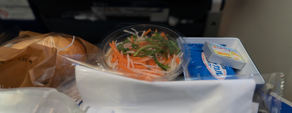 Before landing, a simple snack and tea was served, with Cream bun & Green Tea as the only offering. One point I would like to mention is with regards to ANA's main course packaging. The airline has also opted for a more sustainable option for their main course , it it looks simple but elegant. The material used felt solid, and not cheap in anyway. While there are still some uses of plastic for the appetisers and side dishes, it is a good first step into a more sustainable aviation industry.